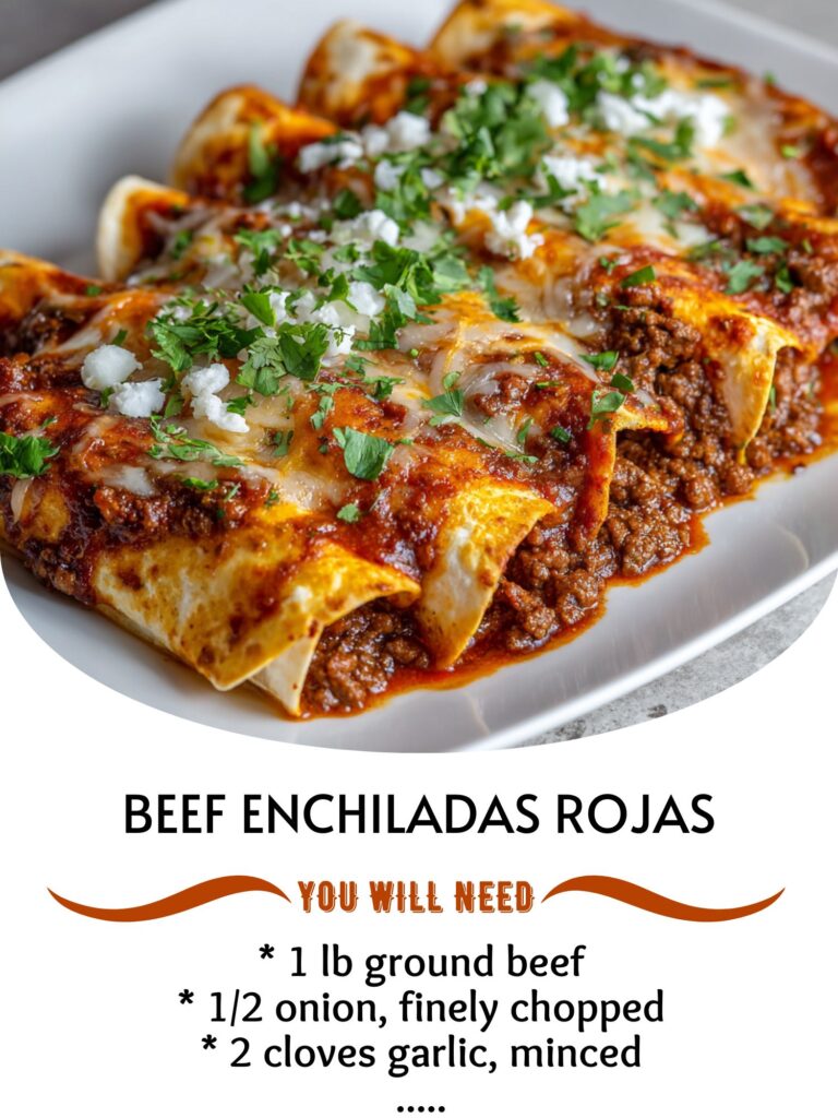 5. Dip each tortilla into the enchilada sauce, then fill with the beef mixture and a sprinkle of cheese. Roll tightly and place seam-side down in a baking dish.