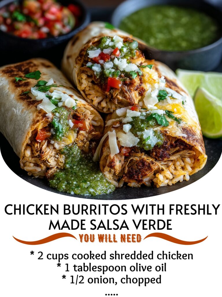 7. Assemble each burrito by layering rice, black beans, chicken, cheese, and a spoonful of salsa verde.