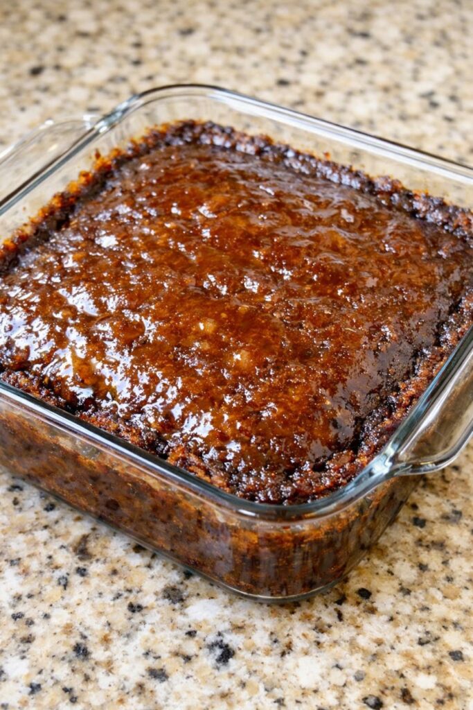 Serve the pudding warm, scooped straight from the glass baking dish. A splash of cold heavy cream, a scoop of vanilla ice cream, or a dollop of lightly sweetened whipped cream plays nicely against the sticky, caramelized top. Strong coffee or hot tea balances the sweetness, while a small glass of milk makes it feel especially nostalgic. If you want to stretch it for a crowd, cut tidy squares and serve on small plates with extra warm sauce spooned over each piece.