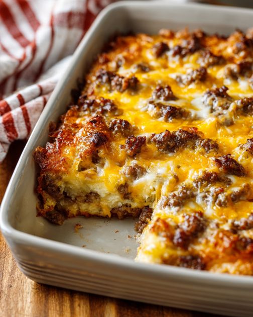 This casserole is hearty on its own, but it pairs really well with something fresh and light on the side. I like to serve it with a simple fruit salad—think berries, sliced bananas, and a handful of grapes—because it balances the richness of the cheese and sausage. If you have a few extra minutes, warm up some store-bought biscuits or toast and set out butter and jam for a little DIY breakfast spread. For a brunch vibe, add a green side salad with a bright vinaigrette and a pot of good coffee. If you’re feeding a crowd, you can round things out with yogurt and granola so everyone can build their own plates depending on how hungry they are.