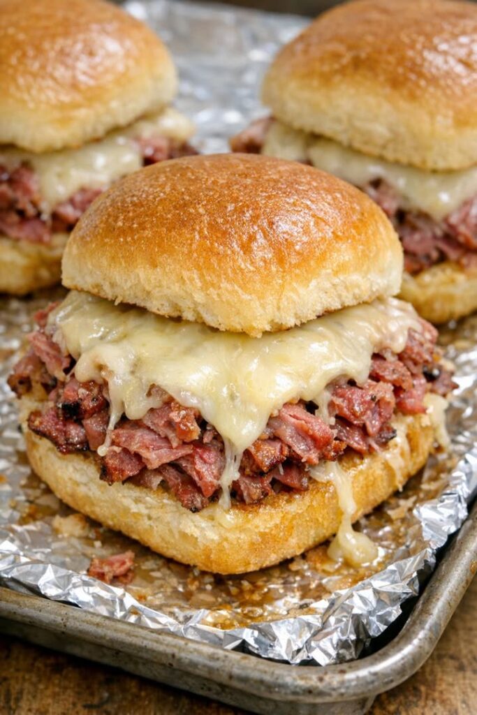 Serve these warm right off the foil-lined baking sheet, while the Swiss cheese is still soft and stretchy. They’re wonderful with dill pickles, potato chips, or a simple bowl of coleslaw for that classic Midwest balance of salty and tangy. If you’re putting out a spread, add a relish tray—carrot sticks, celery, pickles, and olives—just like we used to on Sunday afternoons. A crockpot of tomato soup or a simple vegetable soup turns these sliders into a cozy supper, and for gatherings, a pitcher of iced tea or lemonade fits them like an old pair of farm boots.