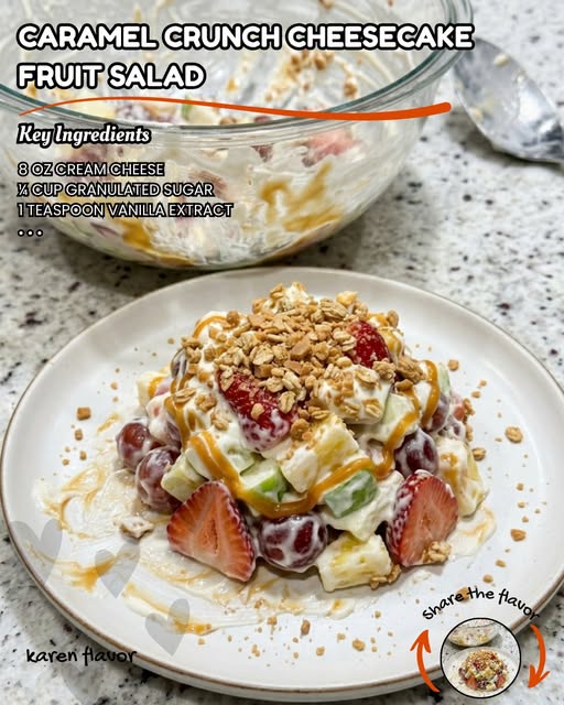 A creamy, dreamy fruit salad that tastes like cheesecake! Fresh fruit is folded into a smooth cream cheese and caramel mixture, then topped with crunchy granola or toffee bits. Perfect for potlucks, parties, or a sweet treat any day.