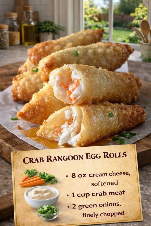 Crispy egg roll wrappers filled with a creamy crab and cream cheese mixture – perfect with sweet chili sauce.