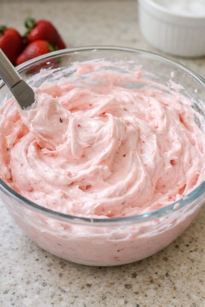 This frosting is wonderful piled high on vanilla or chocolate cupcakes, spread over a simple 9×13 snack cake, or swirled on sugar cookies. It’s especially lovely on strawberry or lemon cake layers. Add fresh sliced strawberries on top right before serving for extra color and flavor. For a fun family night, set out a bowl of this frosting with graham crackers and pretzels for dipping, almost like a strawberry s’mores spread.