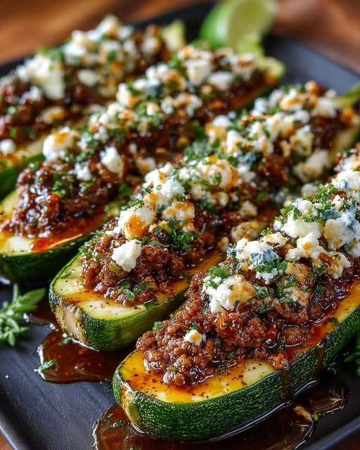Greek Stuffed Zucchini Boats with Spiced Beef, Feta and Hot Honey Drizzle