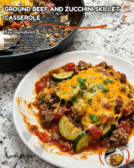 A hearty, one-pan casserole that’s perfect for using up summer zucchini! Seasoned ground beef, tender zucchini, and diced tomatoes simmer together, then get topped with melted cheddar cheese for a quick and comforting weeknight dinner.