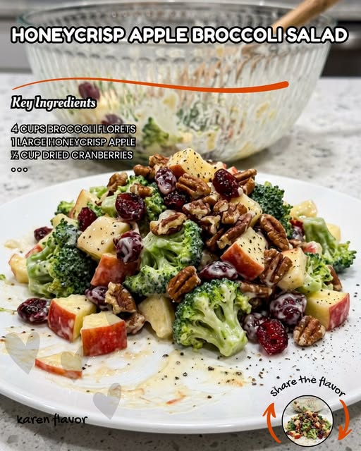A crisp, creamy, and slightly sweet salad that’s perfect for potlucks, barbecues, or a healthy lunch. Fresh broccoli, sweet Honeycrisp apple, dried cranberries, and crunchy nuts are tossed in a tangy honey-mayo dressing.