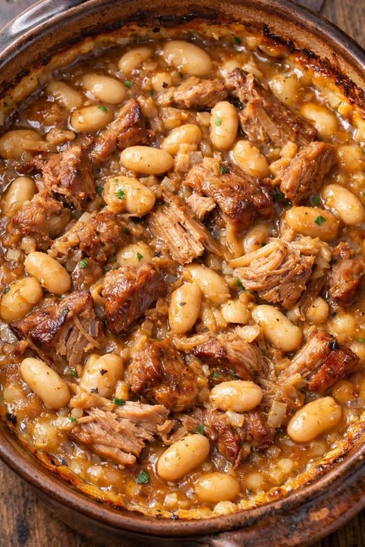 This oven baked 4-ingredient pork and dried bean casserole is the kind of dish my aunt still pulls out every April, just like her mother did when money was tight but the table still had to be full. It’s built on pantry basics: inexpensive pork, dried beans, onions, and a simple gravy that turns rich and velvety in the oven. Long, slow baking transforms humble ingredients into something deeply savory and comforting—fall-apart tender pork tucked into creamy beans, all in one big brown casserole that can feed a crowd for just a few dollars.