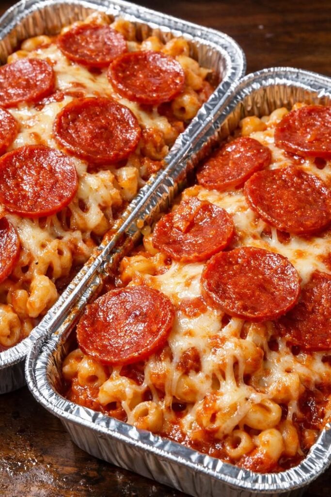For a college-dorm-style meal prep or easy weeknight grab-and-go portions, turn off the slow cooker and let the pasta sit uncovered for about 5–10 minutes to thicken slightly. Then, carefully spoon the hot pepperoni macaroni into two disposable foil trays, spreading it into even layers so the top stays covered in melted cheese and pepperoni slices. Serve hot right away, or cool slightly before covering the trays with foil for transport or storage.