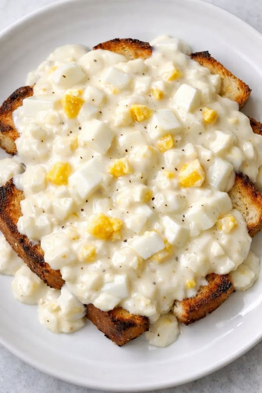 Serve the creamed eggs hot over toasted bread on a simple white plate, with plenty of sauce spooned over the top so it soaks into the toast. A side of sliced fresh fruit or a small green salad helps balance the richness, and a little black pepper on top is lovely if your family likes it. This works for breakfast, lunch, or a light dinner; I often pair it with a cup of coffee in the morning or a glass of cold milk for the kids. If you’re feeding a crowd, set out extra toast pieces and let everyone ladle the creamy eggs themselves.