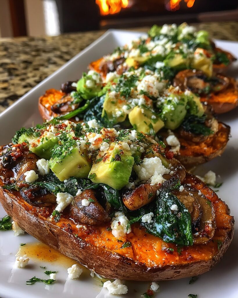 Oven-Baked Sweet Potatoes with Creamy Avocado, Garlic Mushrooms, Spinach & Feta
