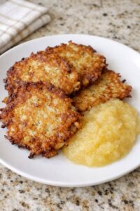 Form and fry the pancakes: Working in batches, scoop about 1/4 cup of the potato mixture into the hot pan