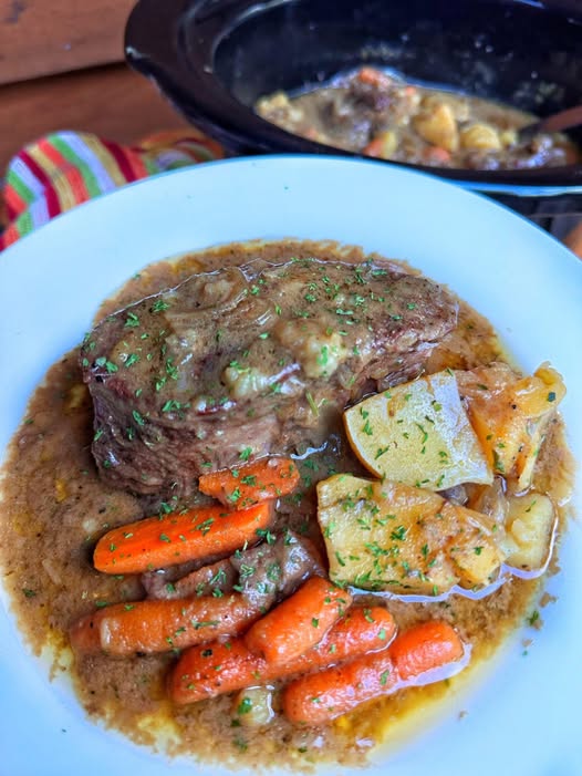 This Pot Roast In The Slow Cooker is a total comfort food dinner that cooks low and slow all day while you do other things. A rich gravy is made from using onion soup mix, cream of mushroom soup, Worcestershire sauce and white wine vinegar. The potatoes and carrots are added in the last hour so that they are the perfect bite. This is a Fall recipe of your dreams.