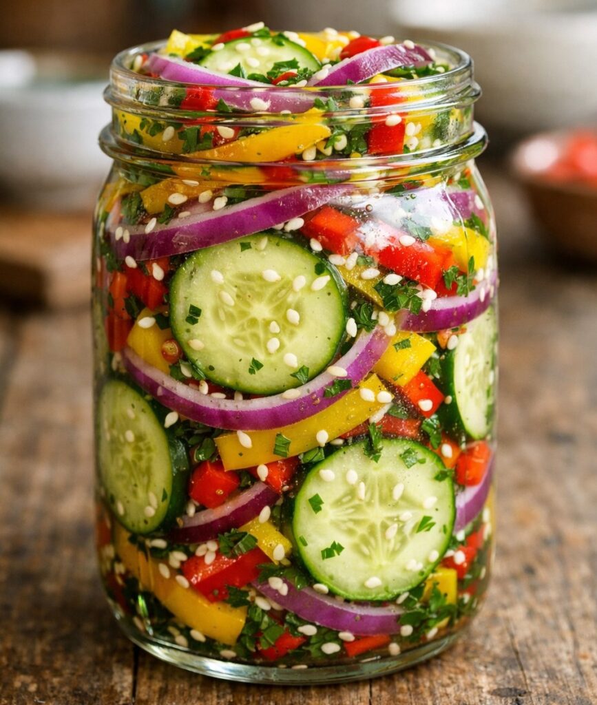 This fresh and tangy salad is a simple recipe made with crisp cucumber, juicy bell pepper, and sharp onion, all soaked in a flavorful pickling liquid. It is called a zero carb salad because it is very low in carbohydrates and perfect for people who want light and clean eating. The recipe does not need cooking, which makes it easy and quick for anyone to prepare at home. The vegetables stay crunchy, and the pickled flavor adds a refreshing twist that feels exciting with every bite. This salad is all about keeping things simple while still enjoying something full of taste.